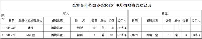 金寨春雨公益协会2025年9月份捐赠物资登记表