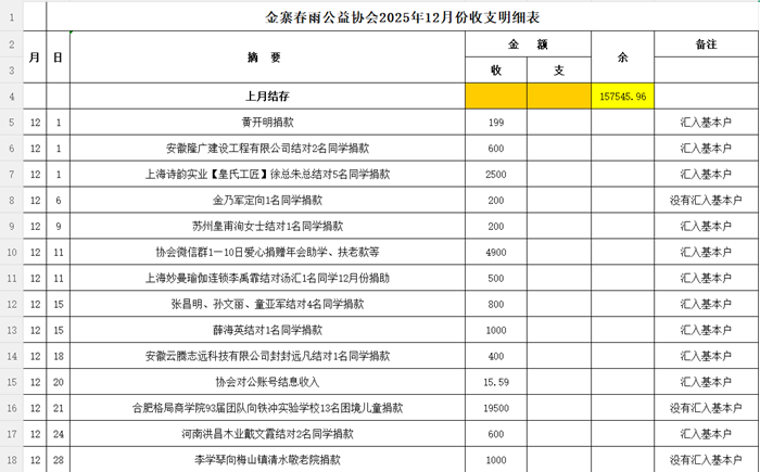 金寨春雨公益协会2025年12月份收支明细表
