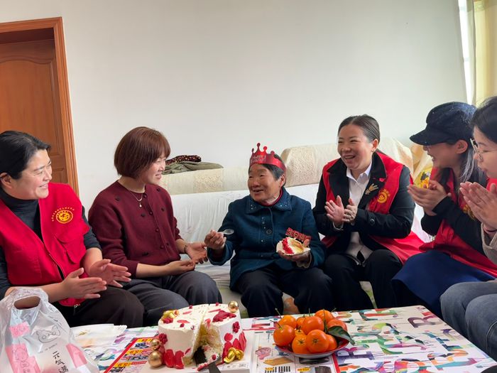 经过两个多小时的齐心协作,一桌丰盛的生日餐终于准备好了。“祝您生日快乐!”在大家的祝福声中,王奶奶颤巍巍地捧起一块生日蛋糕,激动地眼圈红了,声音哽咽地说道“谢谢你们。”此外,社区工作者和志愿者还检查了王奶奶家的用水、用气和用电安全,社区书记当场就答应下午找维修工人解决下水管道漏水问题,让老人安心。