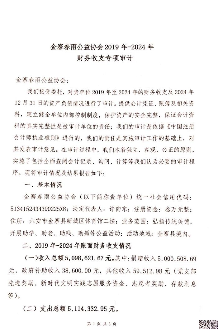 金寨春雨公益协会2019年—2024年财务收支专项审计