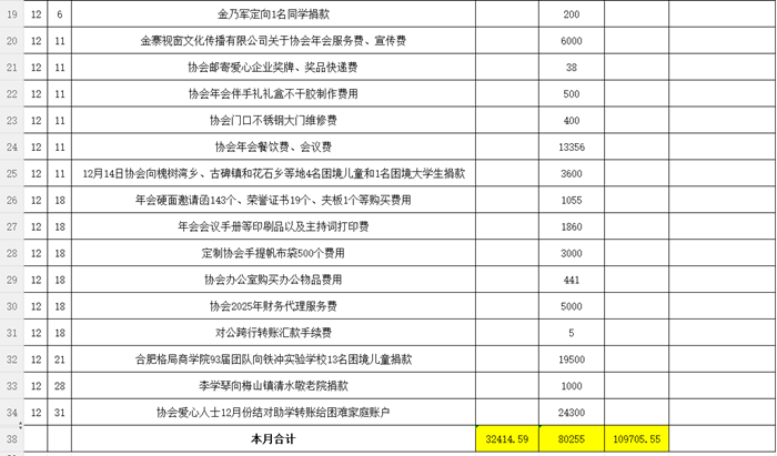 金寨春雨公益协会2025年12月份收支明细表