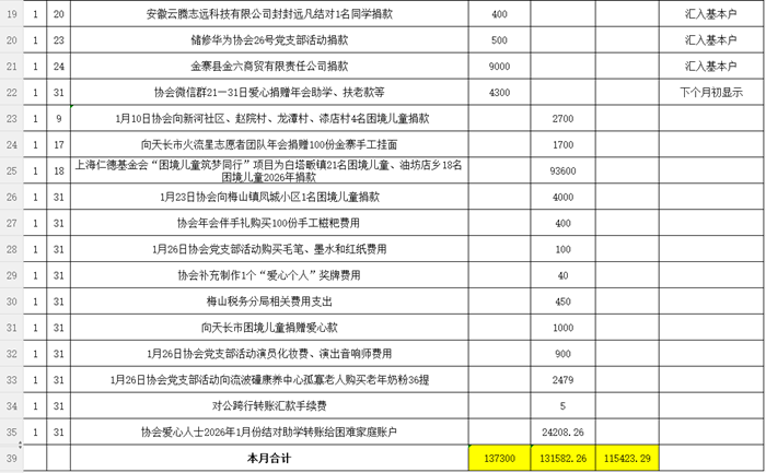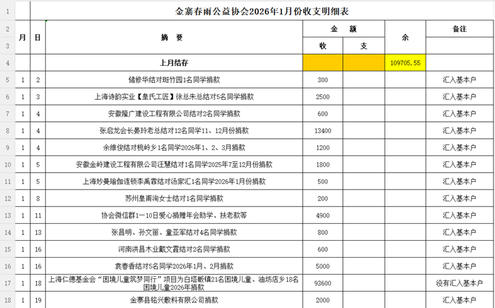 金寨春雨公益协会2026年1月份收支明细表