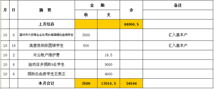 金寨春雨公益协会2015年10月份收支明细表