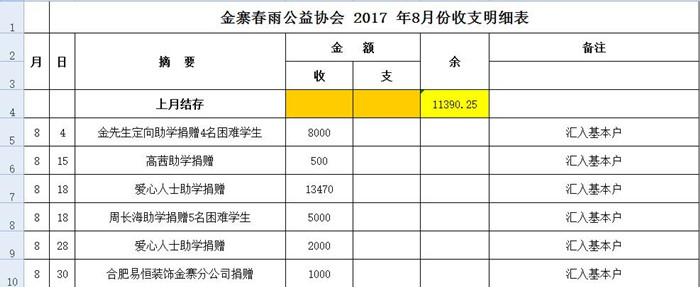 金寨春雨公益协会2017年8月份收支明细表