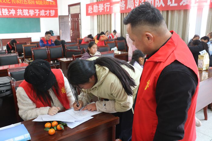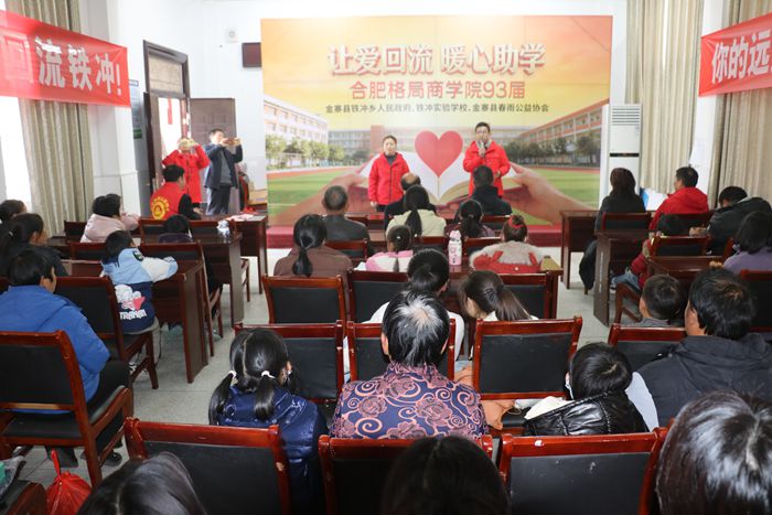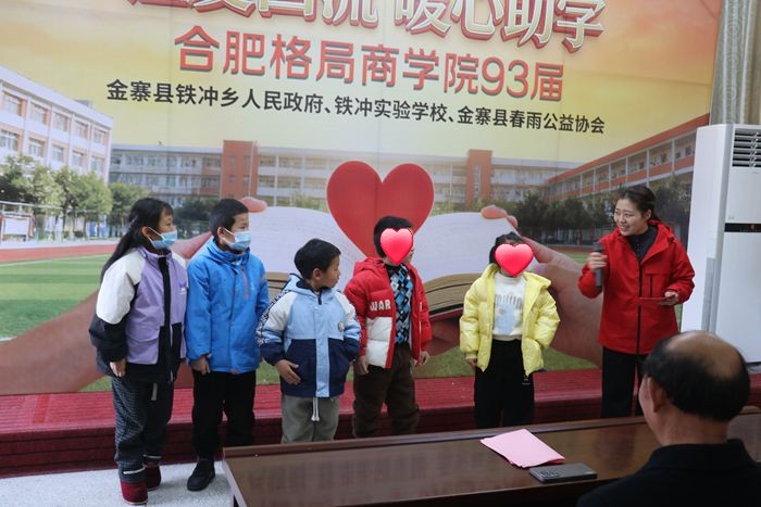 12月21日,合肥格局商学院93届团队一行长途跋涉,向铁冲实验学校13名困境儿童每人捐赠爱心款1500元以及书包、学习大礼包等。县关工委副主任张海滨,铁冲乡党委副书记、乡长廖峰,格局商学院合肥分院院长郭田香等领导和嘉宾参加活动。春雨公益协会17名志愿者提供后勤保障志愿服务。