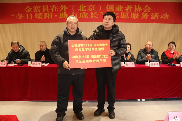 1月23日,金寨县在外(北京)创业者协会会长吴树林一行奔赴金寨县光爱学校,为这里的孩子们捐赠冲锋衣161套、保暖鞋161双以及生活物资若干等。其中,购买物资费用是由协会爱心人士余本水、汪辉、吴立宏和匡光俊等捐赠的。参加活动的还有县委社会工作部副部长黄伟,县民政局副局长杨群,县教育局工会主任胡睿生等相关部门负责人。春雨公益协会提供后勤保障等志愿服务。